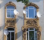 101_9213 Die Fenster des Wohnhauses in der Wilhelmsburger Strasse Vogelhüttendeich sind mit farblich abgesetzten Jugendstil- Dekoren eingefasst. Die Hausfassade ist mit gelb- weiss glasierten Ziegeln verkleidet. An den Fenstern des Hauses sind mehrere Satellitenschüsseln angebracht. >>> |