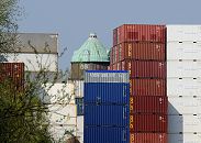 | 181_0232 Containerlager mit Leercontainern am Reiherstieg - die grossen Stahlbehälter haben die Farben der Reedereien, die Schriftzüge voni HAPAG_LLOYD, EVERGREEN, HAMBUERG SÜD und GRIMALDI GROUP sind zu erkennen. Die leeren Container sind auf >>> | 182_6946 Ein Container wird von einem Container Carrier auf den Güterwaggon eines Eisenbahnzugs geladen - ein Arbeiter in Signalkleidung und Helm überwacht die Arbeit. Auf der Strasse fährt ein Sattelzug mit einem Containertransport. >>> |