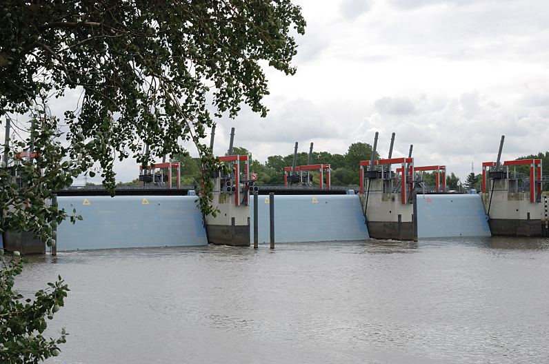 1443_3593 Blick von Entenwerder auf die geschlossenen Tore der Hochwasserschutzanlage. Das Sperrwerk bietet Schutz vor Sturmfluten von bis zu 8,10 m. Bei Hochwasser werden die ca. 250 Tonnen schweren Tore herunter geklappt. Das Sperrwerk ist nach dem Eider-Sperrwerk das zweitgrößte in Deutschland.