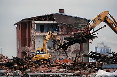 abgerissen; ein Abrissbagger zerkleinert Bauschutt.