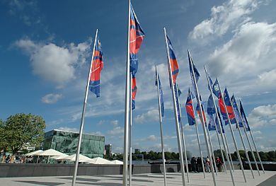 - Hamburg - Flaggen am Anleger; im Hintergrund der Hamburger Fernsehturm.