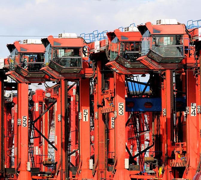 11_6889 Abgestellte Portalhubwagen auf dem Container Terminal EUROGATE - das rundumverglaste  Führerhaus gewährt dem Fahrer einen guten Überblick über seinen Arbeitsbereich. Je nach Höhe des Van Carriers können drei Container übereinander gestapelt werden.