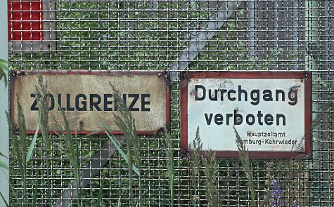 - Hinweisschilder am Maschendrahtzaun: Zollgrenze, Durchgang
