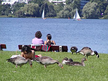 Schwanenwik, Graugänse am Alterufer, Alsterschiff |
