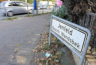 | 4036 Detail Fassadenskulptur Adler Terrakotta; ehem. Kaserne Lettow-Vorbeck in Hamburg Jenfeld. >>> | 9366 Stadtteilschild an der Strasse - Weisses Schild mit schwarzer Schrift Jenfeld - Bezirk Wandsbek. >>> | 9405 Gebäude des Einkaufszentrum Jenfeld - Wohngebäude, Wohnblocks im Hamburger Stadtteil. >>> | 9423 See am Jenfeder Moor - Insel mit Bäumen, am Seeufer Bäume mit Herbstlaub. >>> | ||||||