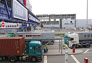 Lastzüge mit Containern werden an der Einfahrt des