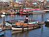 den Wasser- treppen des Spreehafens liegen Arbeitsboote und Hausboote in