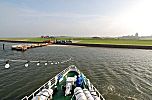 067_4813 Das Schwinge Sperrwerk ist nach der Sturmflut von 1962 gebaut und 1971 in Betrieb genommen worden. Das Sperrwerk schützt die Stadt Stade und das Industriegebiet Bützflether Sand. Ein Segelboot fährt mit seinem Hilfsmotor auf das geöffnete Sperrwerk zu. >>> |