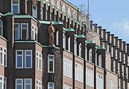 33_48051 Die Hamburgflagge weht auf dem Gebäudedach des Montanhofs; das expressionistische Klinkergebäude der Architekten Distel + Grubitz ist mit Skulpturen an der Hausfassade dekoriert. >>>>> |