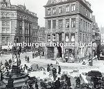 33_48001 Blick über den Markt auf dem Messberg zur Fischerstwiete, rechts der Vierländer Brunnen - die Vierländer Bäuerin blickt Richtung Wandrahmsbrücke. Die Marktfrauen haben ihre Verkaufsstände aufgebaut und die Ware ausgepackt. In den Häusern am Messberg sind die Geschäfte geöffnet, u. a. haben hier eine Weinhandlung, Fleisch Fettwaaren >>> |